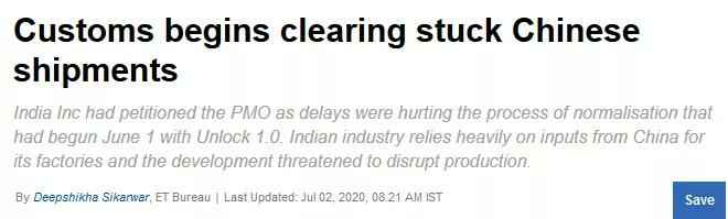 据印度时报报道,由于印度多个行业协会等机构向包括印度总理办公室、印度财政部、商务部、工业部、化工部、中小微企业委员会等机构反映货物清关问题:自6月1日印度实施复工以来,印度港口实施的清关暂停对严重依赖于中国上游产业链的印度工厂的正常生产带来巨大伤害,直接打乱工厂的正常生产;导致企业正常生产困难。已从周三开始印度海关对来自于中国过去10天的货物开始进行清关工作。